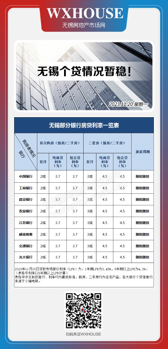 从小编致电的8家银行反馈情况来看,目前无锡个贷较为稳定:首套房首付2成起,个贷利率最低按照3.7%执行;二套房首付3成起,个贷利率最低按照4.5%执行!