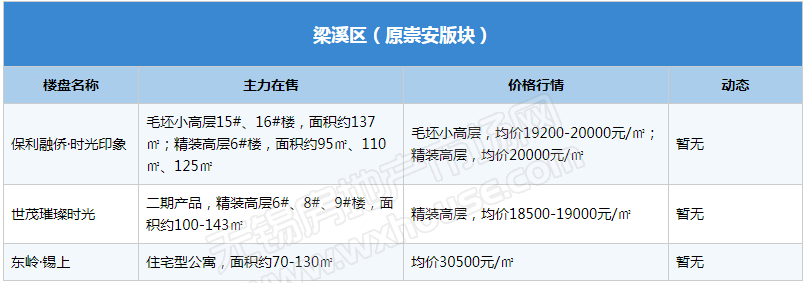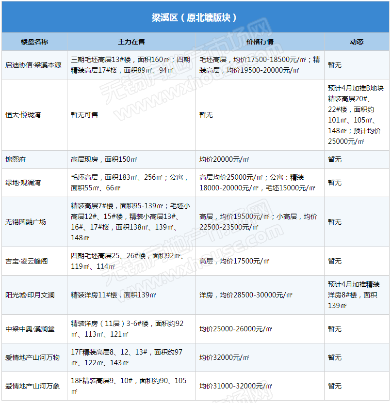 3月锡城主流在售项目及产品最新情报呈上。3月楼市成交稳步攀升,不少楼盘已经进行了一波加推抢占“金三”,接下来包括愉樾天成、熙悦·滨湖湾、华侨城·运河湾、恒大·悦珑湾、阳光城·印月文澜、金融街·融府、万科·梅里上城、无锡海尔创智谷、金辉天奕銘著、百郦华庭、绿城诚园等一大波项目表示将在近期加推,。(注:下表整理内容为锡城主流楼盘、主流物业,均为售楼处报价)