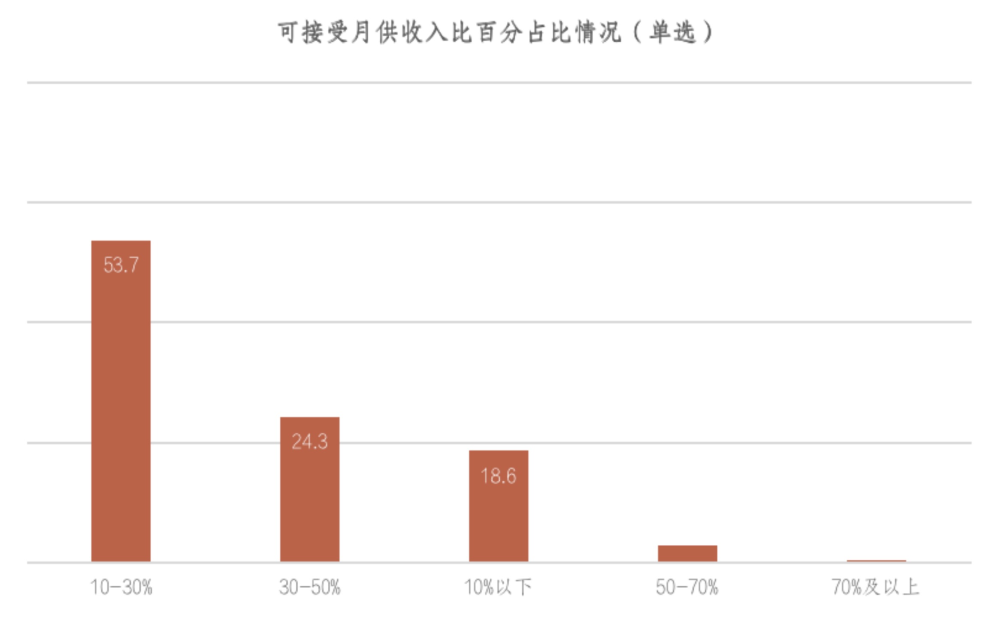 《报告》对新青年家庭可接受的月供收入比作出调查,结果显示,超过一半的受访者(53.7%)表示,可接受的月供收入比在10-30%之间,其次是30-50%的区间范围,占比约为24.3%。同时,30%以下占比达到72.3%。