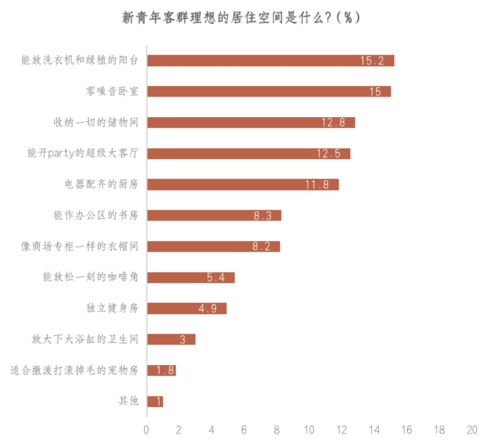 在理想空间方面,《报告》调研数据表明,超过一半的受访者(56.5%)表示,他们更关注卧室的舒适度,其次是客厅,占比约为22.9%。具体到空间需求,15.2%的受访者表示希望拥有“能放洗衣机和绿植的阳台”,15%的受访者表示希望拥有“零噪音卧室”,12.8%的受访者表示希望拥有“收纳一切的储物间”,12.5%的受访者表示希望拥有“能开party的超级大客厅”,11.8%的受访者表示希望拥有“电器配齐的厨房”。从结果看,阳台、卧室、储物间、客厅及厨房成为新青年客群最看重的居住空间。