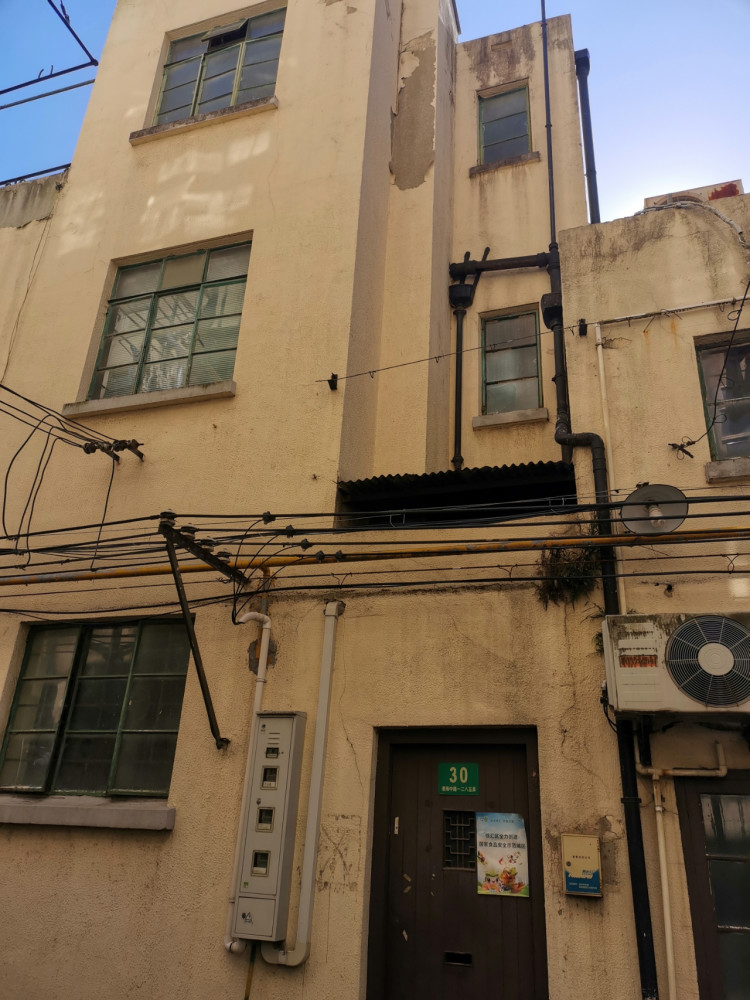 本次被司法拍卖的30号小洋楼,位于右手边第一个里弄。历经近百年风吹雨打,洋楼显现出一种饱经沧桑的破旧感,墙皮剥落、污渍成片,墙体上还有细小的裂纹,顶层的窗户已见破碎。