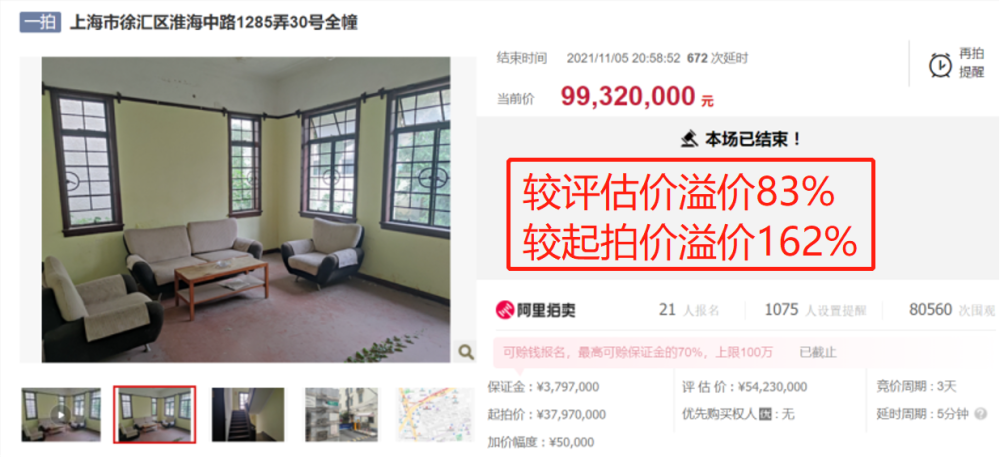 “血拼到底”的结果是起拍价3797万的老洋房最终以9932万元成交,溢价率高达162%。