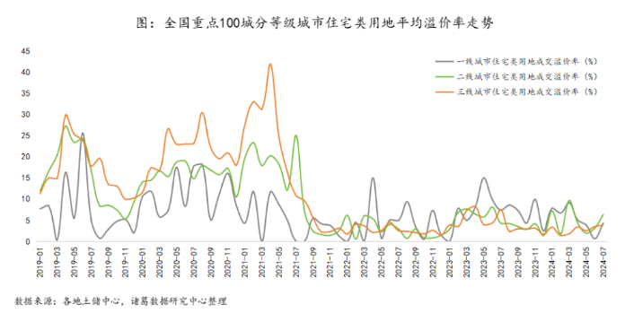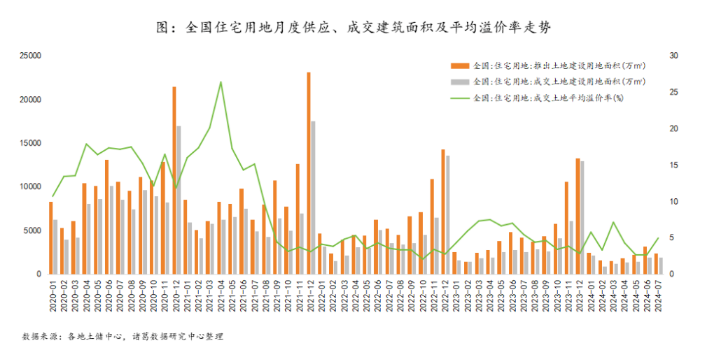溢价率方面,7月份全国住宅用地平均成交溢价率为4.95%,较上月上升2.26%,但远低于2021上半年以前水平。