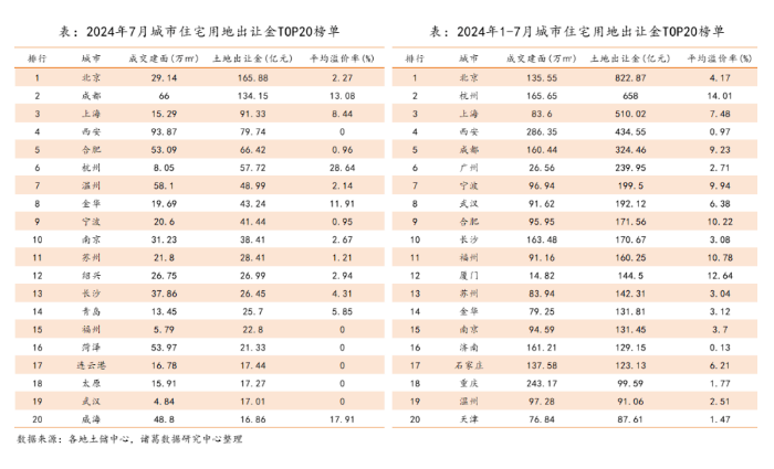 从1-7月城市住宅用地出让金TOP20来看,北京以822.87亿元位居全国首位;杭州以658亿元位居土地出让金第二,其热度更是处于明显领先地位,前7月平均溢价率超14%。另外,合肥、福州和厦门热度也是不俗,年内溢价率均超10%,前7月土地出让金分别为171.56亿元、160.25亿元和144.5亿元。