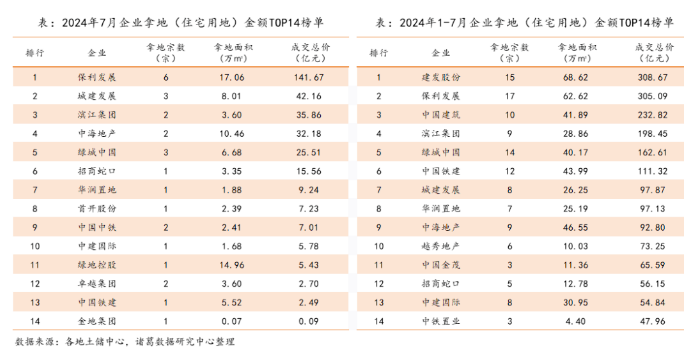 报告显示,保利发展今年以来拓储步伐稳健,7月单月继续掷资141.67亿元拿下6宗住宅用地,前7月共计拿下17宗宅地,总拿地金额高达305.09亿元。城建发展凭借42.16亿元夺得7月单月拿地金额第二位。中海、招商蛇口、华润等品牌国央企当月土储亦有收获。