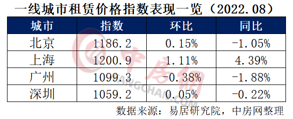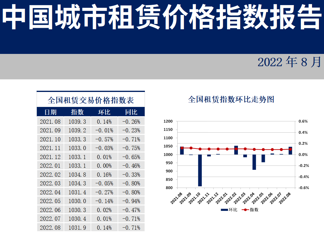 近日,由易居企业集团、上海易居房地产研究院、华东师范大学东方房地产研究院三方共同发布的《中国城市住房租赁价格指数报告》显示,2022年8月,中国城市租赁价格指数为1031.9点,较上月上升1.5点,环比上涨0.14%,同比跌幅0.71%。