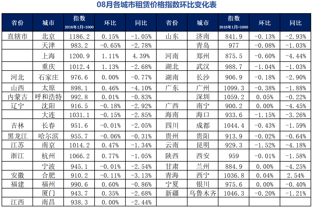 从环比方面看,其监控的35个城市中,有11个城市租赁价格指数出现上涨,上涨城市数量比7月份增加2个城市,其中重庆(1.13%)、上海(1.11%)和杭州(0.77%)涨幅较大;有19个城市(长春、宁波、西安、贵阳、哈尔滨、青岛、合肥、济南、大连、沈阳、长沙、乌鲁木齐、广州、成都、郑州、天津、武汉、海口、昆明)租赁价格指数出现不同程度下跌,下跌城市数量比7月份减少4个城市。其中,昆明(-1.52%)、海口(-1.15%)和武汉(-1.04%)跌幅较大,跌幅均超1%。除此之外,石家庄、南昌、银川、南宁和兰州5个城市租赁价格指数与7月份持平。