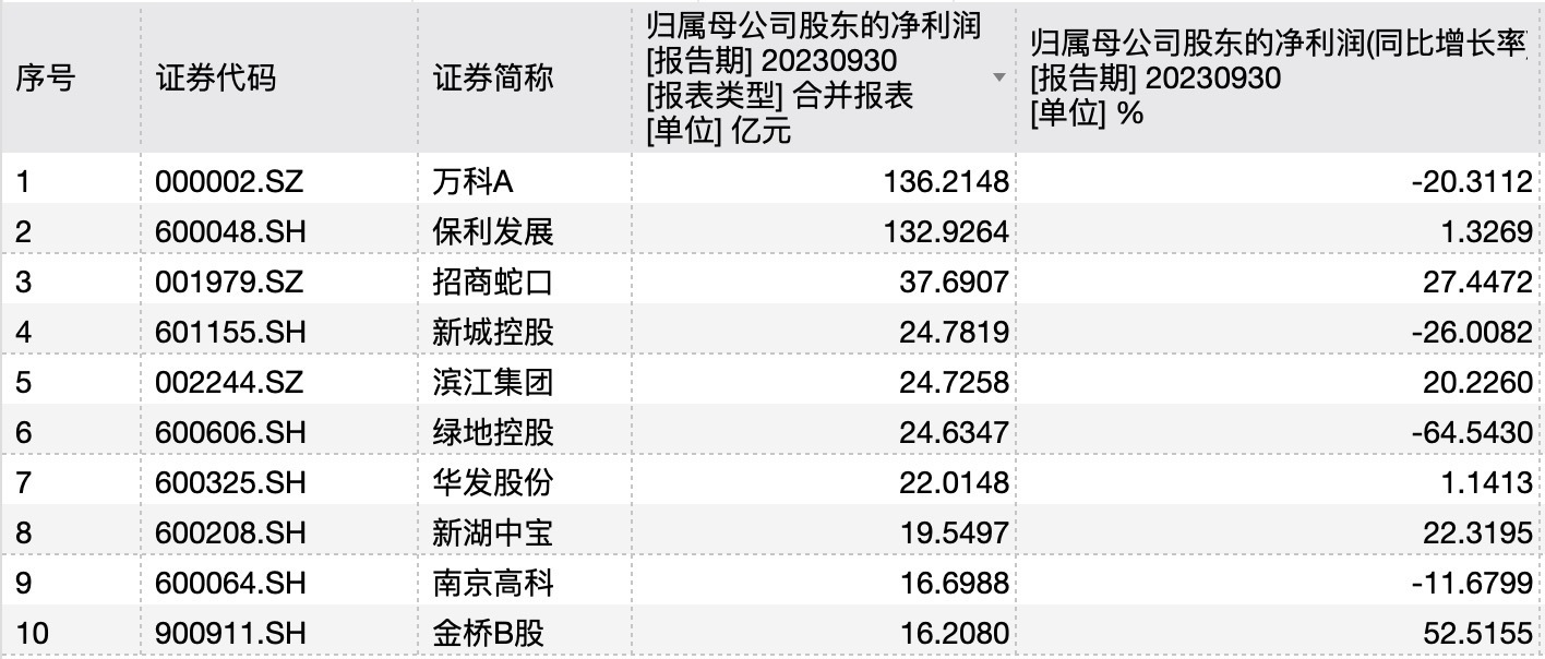 2023年前三季度A股上市房企归母净利润TOP10 来源:Wind