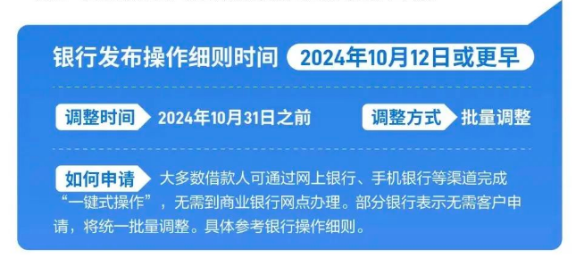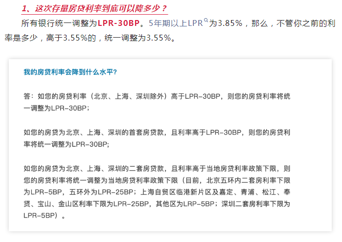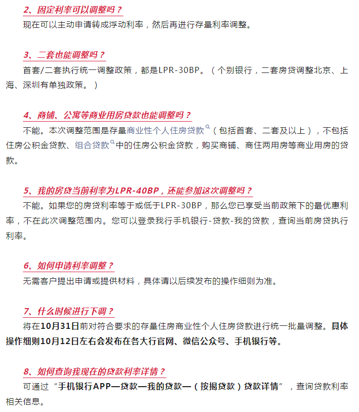 市场网首页 > 新闻中心 > 各地新闻 > 正文 统一下调30BP!九大银行公布存量房贷利率下调细则! 2024-10-11 13:13:15 各大银行以及21世纪经济报道 10月10日,中行、工商、农业、建设、交通、招商、浦发、兴业、浙商银行等多家银行发布存量房利率调整问答,具体细则曝光。 重点如下: 1、所有银行统一调整为LPR-30BP; 2、基本确定10月31日前完成统一调整,但每个人情况不同,具体要根据「贷款重新定价日」来看; 3、固定利率需要先转为浮动利率,再参与利率调整; 4、二套房也可参与,公寓、商铺不能。 以下为几大银行发布的问答细则整理: 以下是各家银行公布的相关细则: (责任编辑:张一男)