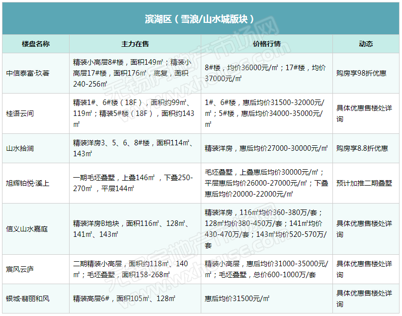 10月启幕,锡城主流在售项目及产品最新情报呈上。作为楼市传统销售旺季,9月成绩单并不算理想,房企更要抓紧10月销售期,不少楼盘在十一国庆假期推出了优惠活动,但据了解,目前部分十一特惠、一口价房源已售罄或收回,后续优惠计划方案暂未制定实施。近期有加推计划的楼盘并不多,仅融创·CHINA山水江南、旭辉铂悦·溪上等,十月拭目以待。(注:下表整理内容为锡城主流楼盘、主流物业,均为售楼处报价)