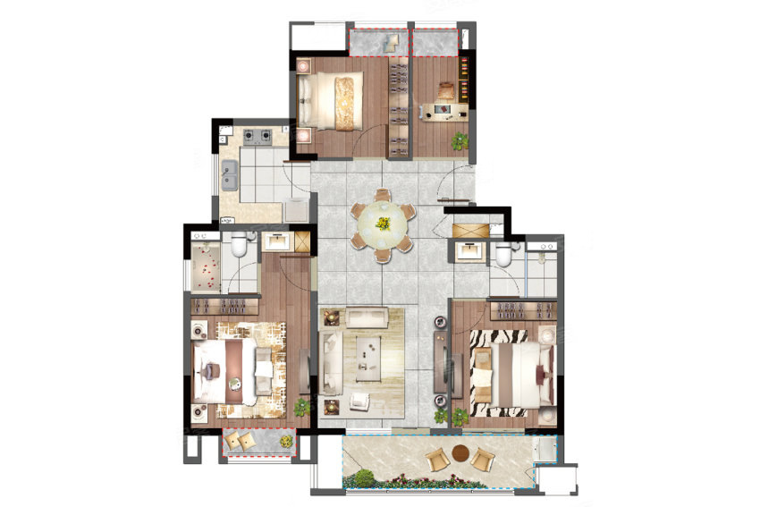 设计亮点:“围合式”的布局有效减少过道面积浪费,可以说室内空间充分利用;宽景双阳台给以大面积采光,客厅及南向次卧中间设计为轻质隔墙,若有需要,可将空间打通,打造为适宜儿童娱乐的大空间;北向次卧与书房中间同样采用轻质隔墙设计,空间百变;双卫生间设计更适宜2代、3代人同时居住。