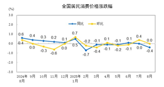 2025年8月份,全国居民消费价格同比下降0.4%。其中,城市下降0.3%,农村下降0.6%;食品价格下降4.3%,非食品价格上涨0.5%;消费品价格下降1.0%,服务价格上涨0.6%。1—8月平均,全国居民消费价格比上年同期下降0.1%。