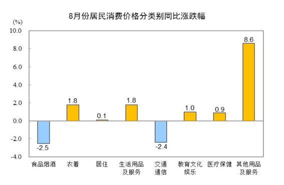 其他七大类价格同比六涨一降。其中,其他用品及服务、衣着、生活用品及服务价格分别上涨8.6%、1.8%和1.8%,教育文化娱乐、医疗保健、居住价格分别上涨1.0%、0.9%和0.1%;交通通信价格下降2.4%。
