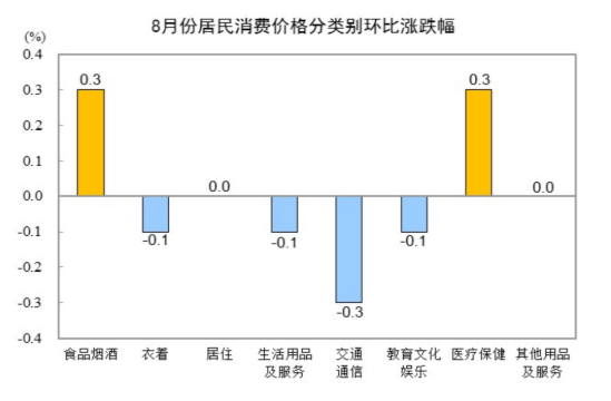 其他七大类价格环比一涨两平四降。其中,医疗保健价格上涨0.3%;居住、其他用品及服务价格均持平;交通通信价格下降0.3%,衣着、生活用品及服务、教育文化娱乐价格均下降0.1%。