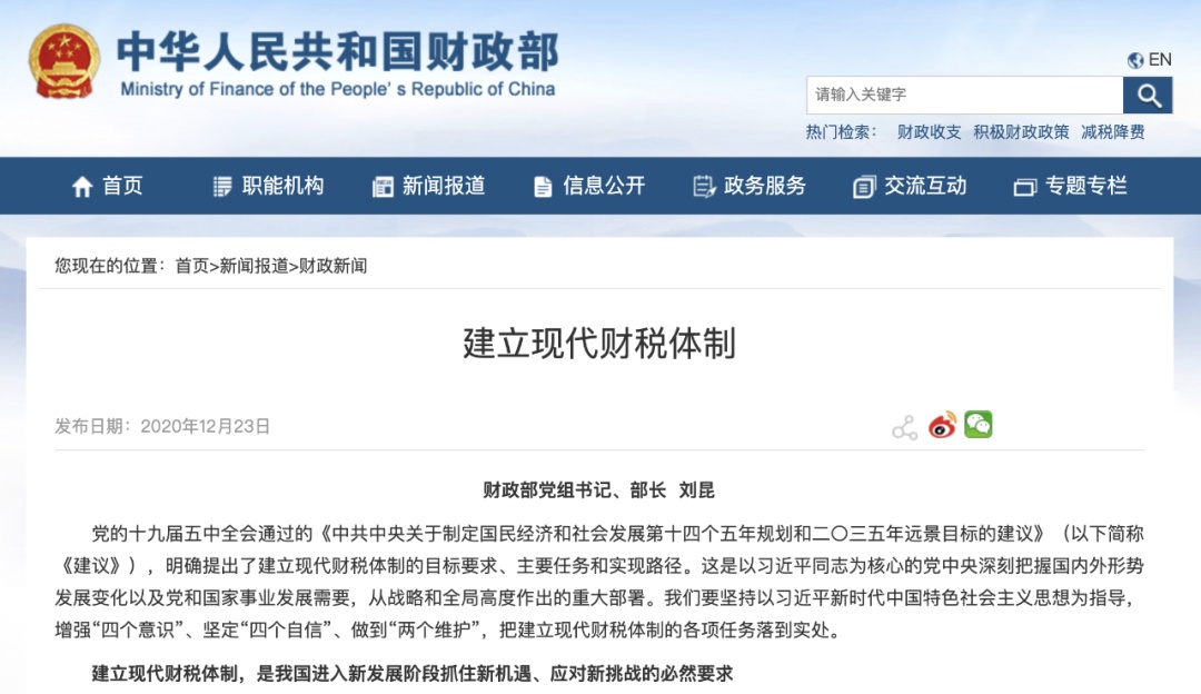 12月23日,财政部的官网刊登了来源于人民日报的《建立现代财税体制》一文,作者是财政部部长刘昆,文章谈及房地产税: