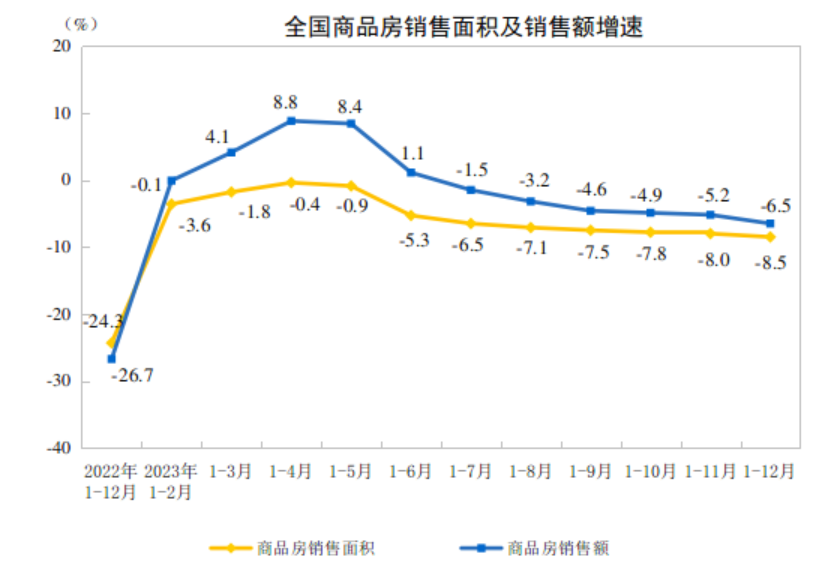 据国家统计局数据,2023年全国商品房销售面积111735万平方米,同比下降8.5%,其中住宅销售面积下降8.2%;商品房销售额116622亿元,同比下降6.5%,其中住宅销售额下降6.0%。
