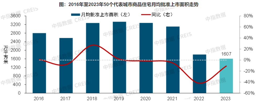 此外,房企供货能力、供货意愿不足。据中指研究院监测,50个代表城市2023年商品住宅批准上市面积同比下降超10%,月均批准上市面积约1600万平方米,同比下降约11%,供给端表现整体偏弱。而在供需均走弱的背景下,重点50城整体表现供小于求。据初步统计,2023年,50个代表城市商品住宅月均新增供应约1600万平方米,同期月均成交面积为1955万平方米,销供比为1.22.高于2022年水平。