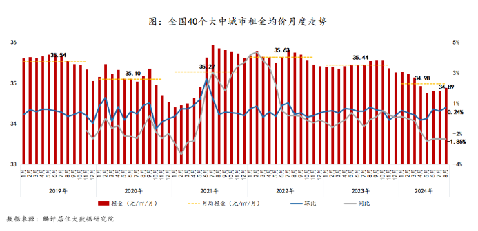 麟评居住大数据研究院近日发布的报告显示,8月份全国40个大中城市租金挂牌均价为34.89元/平方米/月,环比上涨0.24%;同比下跌1.85%,同比已连续10个月下跌。1-8月份,全国大中城市平均租金为34.98元/平方米/月,较2024年月均租金下降1.3%。