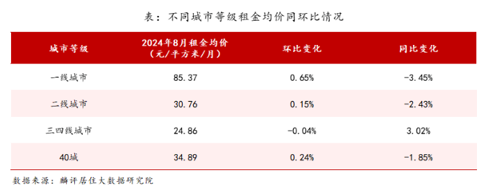 分等级城市来看,报告显示,2024年8月一线城市平均租金为85.37元/平方米/月,环比上涨0.65%,同比下跌3.45%;二线城市平均租金为30.76元/平方米/月,环比上涨0.15%,同比下跌2.43%;三四线城市平均租金为24.86元/平方米/月,环比下跌0.04%,同比上涨3.02%。