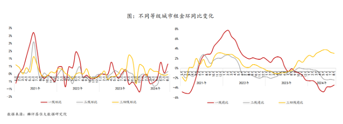 同比方面,仅三四线同比持续为正;一、二线城市租金同比仍在下跌,已分别连续下滑14个月和10个月。