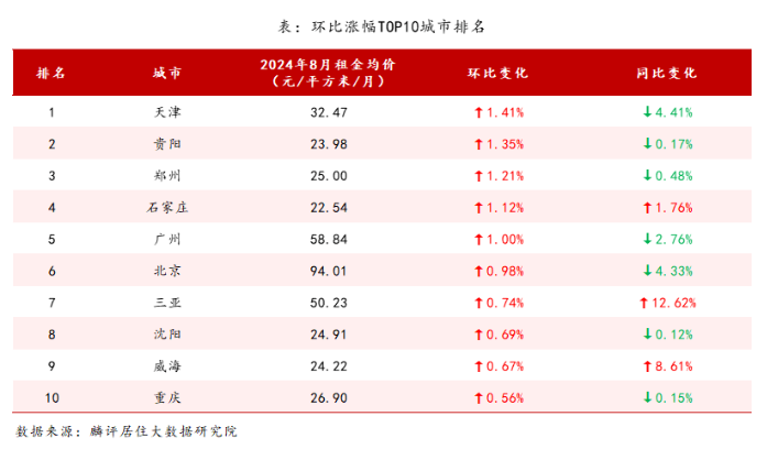 从环比涨幅TOP10城市来看,天津持续领跑,租金环比上涨1.41%,毕业季带动下近三月租赁需求明显活跃;贵阳和郑州位居第二位和第三位,环比分别上涨1.35%和1.21%。