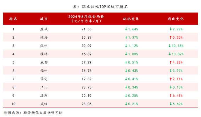 其中,盐城跌幅居首,8月租金环比下降1.64%,并连续4个月进入跌幅TOP5;珠海租金均价为35.39元/平方米/月,环比下降1.37%位居第二;温州和桂林环比分别下降1.12%和1%位居第三、四位。此外,成都、福州、保定、江门、洛阳和武汉等城市,租金价格环比降幅均在0.6%以下。