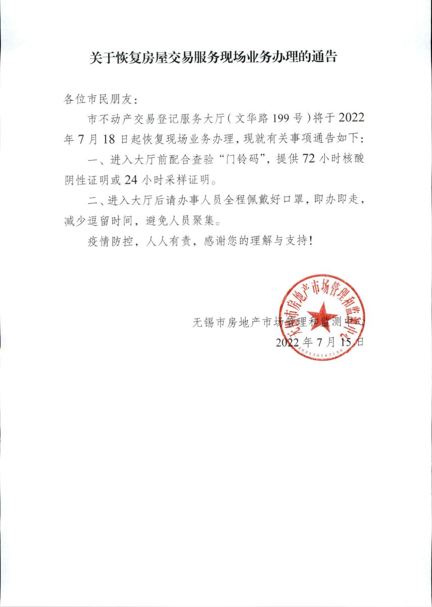 市场网首页 > 新闻中心 > 独家 > 正文 关于恢复房屋交易服务现场业务办理的通告 2022-07-15 15:41:01 无锡房地产市场网 本文为无锡房地产市场网原创,谢绝各类形式的转载、刊登。未经许可,私自转载者,本站将追究其相关法律责任。 (责任编辑:陈柯)
