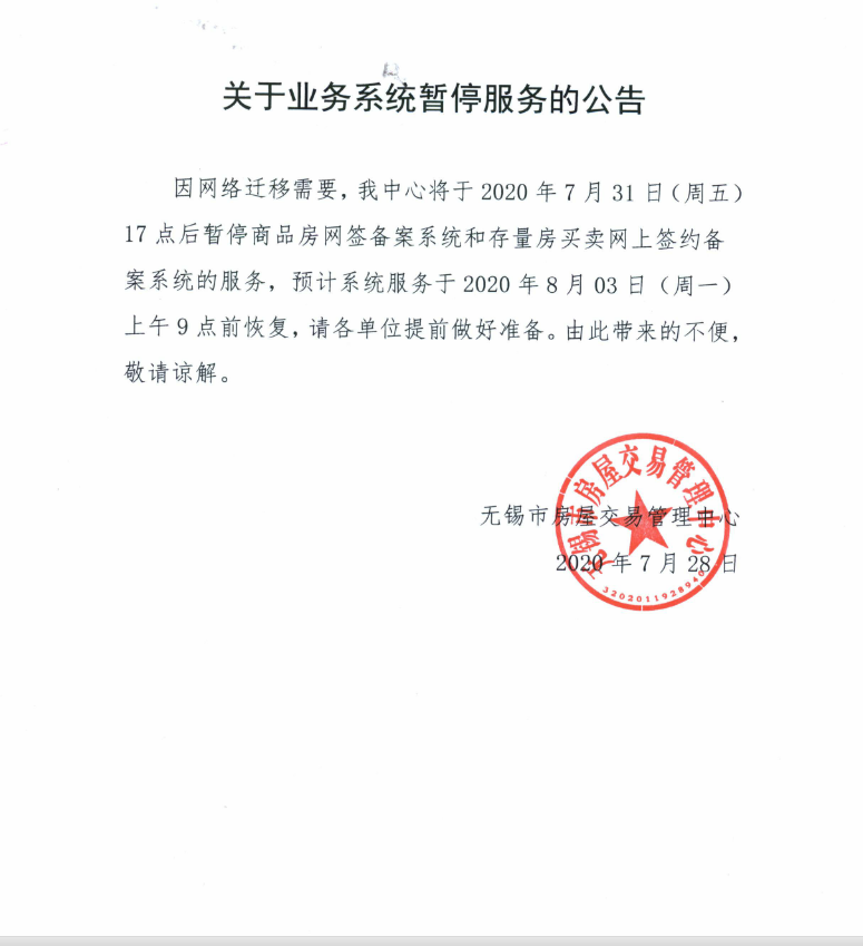 市场网首页 > 新闻中心 > 独家 > 正文 公告:7月31日17点后暂停商品房和存量房网签 2020-07-28 15:28:12 无锡房地产市场网 本文为无锡房地产市场网原创,谢绝各类形式的转载、刊登。未经许可,私自转载者,本站将追究其相关法律责任。 (责任编辑:李飞飞)