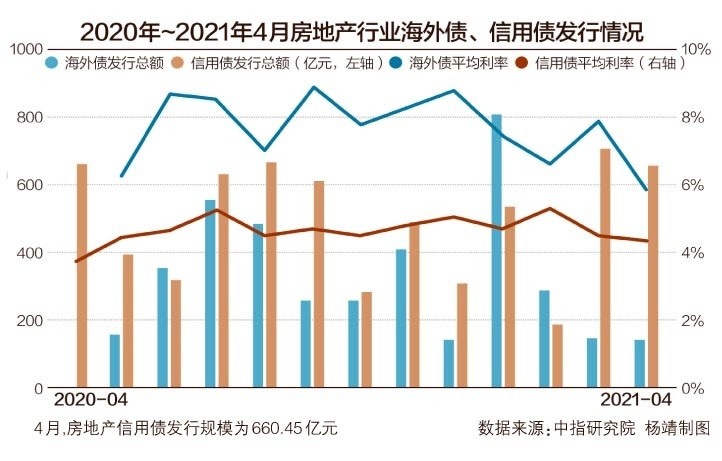 具体来看,4月房地产信用债发行规模为660.45亿元,相较于3月的714.41亿元降低7.55%;4月内地房企海外债发行规模为144.7亿元,相较于3月153.5亿元降低5.73%。