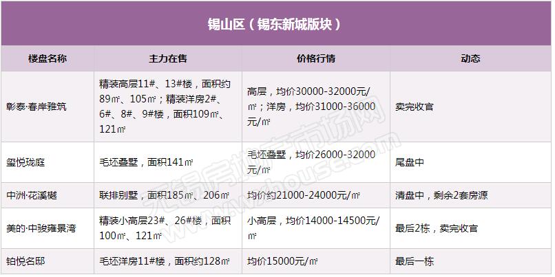 锡山区:锡东新城、鹅湖、东港、羊尖等板块均有准收官盘,高层、小高层、洋房、别墅均包含;