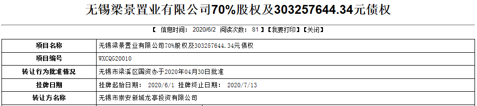 2020年6月2日,无锡产权交易所挂牌无锡梁景置业有限公司70%股权及303257644.34元债权,挂牌终止日期为2020年7月13日,转让底价为31194.454434万元。