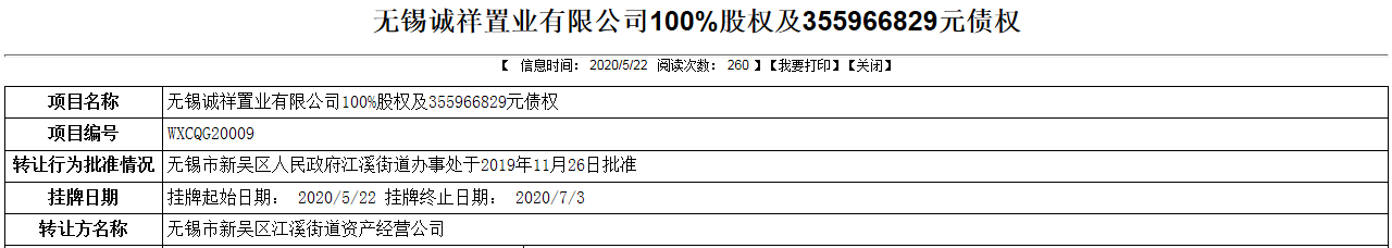 2020年5月22日,无锡诚祥置业有限公司100%股权及355966829元债权在无锡产权交易所挂牌,挂牌终止日期为2020年7月3日,转让底价为46027.904万元。