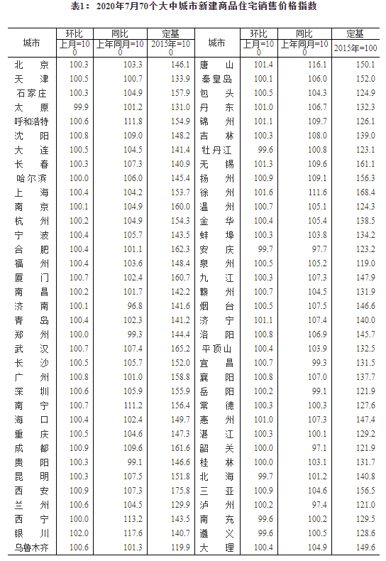 2020年7月份,各地深入贯彻落实党中央、国务院部署,坚持房子是用来住的、不是用来炒的定位,不将房地产作为短期刺激经济的手段,着力稳地价、稳房价、稳预期,因城施策、一城一策,及时科学精准调控,促进房地产市场平稳健康发展,70个大中城市房地产市场价格总体平稳。