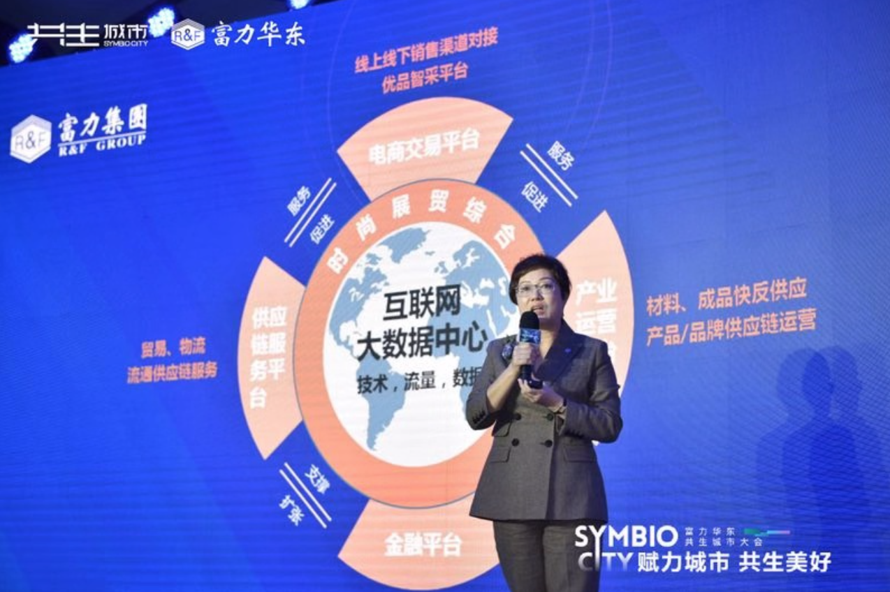 富力集团副总经理兼富力环贸港副董事长程怡介绍了富力环贸港的发展。她表示,富力环贸港是富力集团跨界发展以及产城融合又一跨越,运用全产业链服务线上应用程序+数字化运营+线下智能场馆,打造一个全新的商贸流通体系,聚焦于时尚产业,定位打造“一手货源时尚品牌展贸集中地”,利用“数据智能”,赋能商户玩转新商贸。