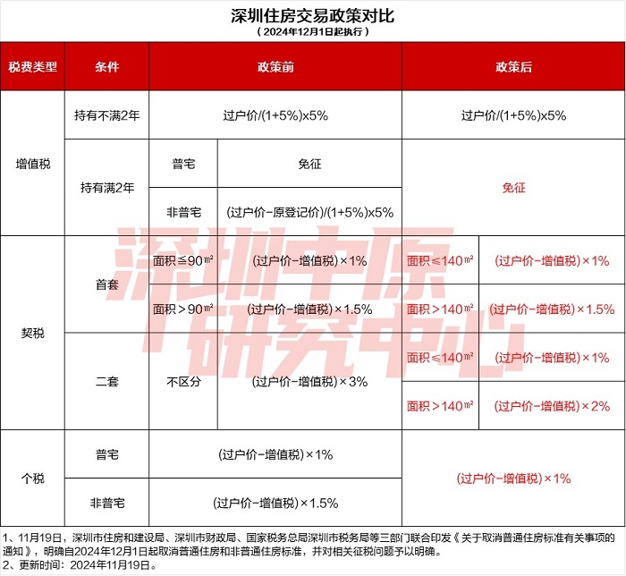 11月19日,深圳市住房和建设局、深圳市财政局、国家税务总局深圳市税务局等三部门联合印发《关于取消普通住房标准有关事项的通知》(下称《通知》),明确自2024年12月1日起取消普通住房和非普通住房标准,并对相关征税问题予以明确。