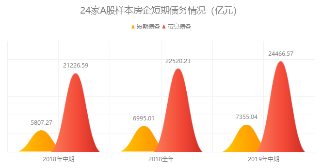 观点指数统计,截止2019年中期,68家样本上市房企的带息债务达到58997.36亿元(港股由于数据统一问题,仅包含短期借款和长期借款)。其中仅24家A股样本房企,2019年中期的带息债务为24466.57元,短期债务为7355.04亿元,占比30%,2018年同期该比率为27%。