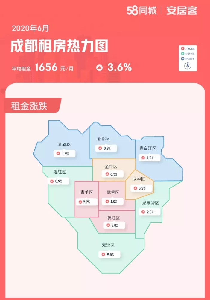 新一线城市中,成都6月份新增房源量整体出现27.2%的环比增幅,锦江、青羊出现40%以上的环比涨幅。相对于新增房源量的上涨行情不同的是,成都租房热度出现2.5%的环比小幅下滑。