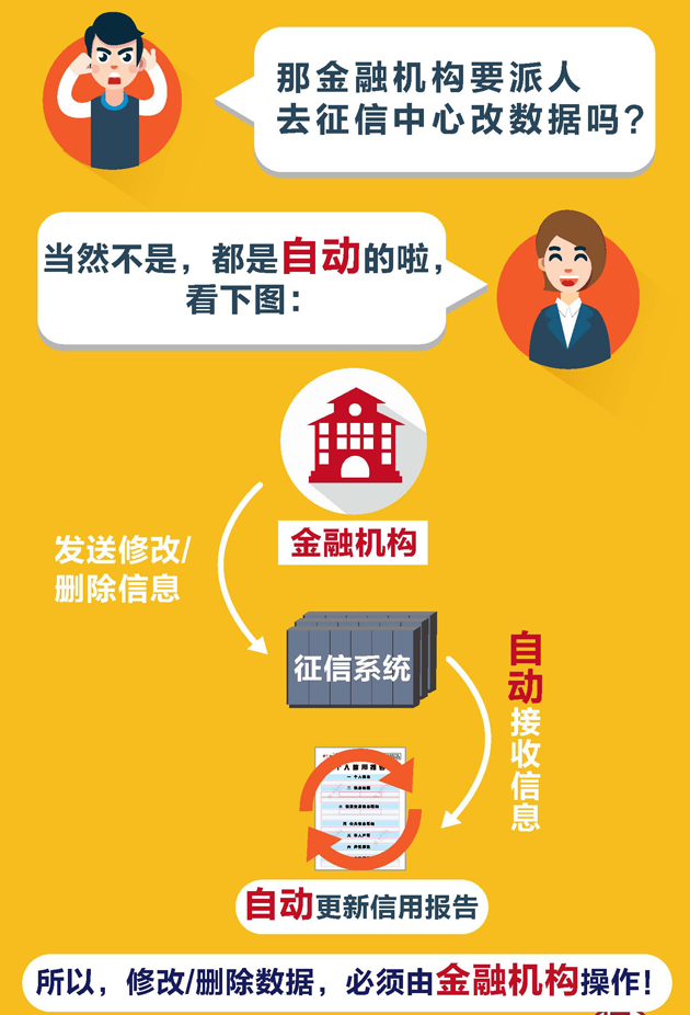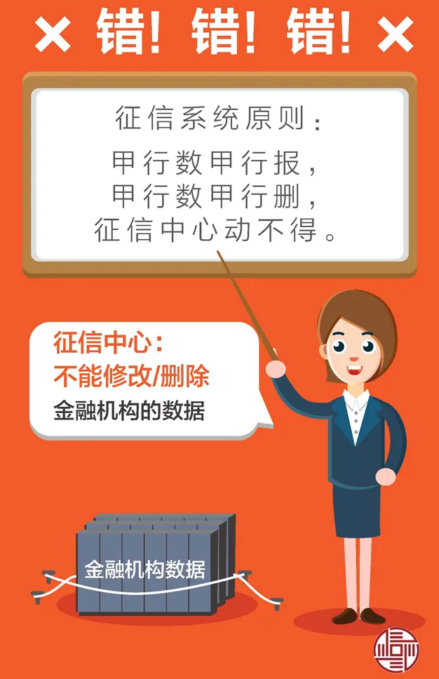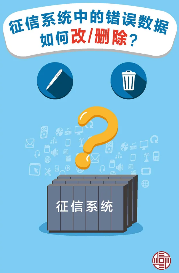 市场网首页 > 新闻中心 > 各地新闻 > 正文 中国人民银行:征信系统中的错误数据如何改/删除? 2021-04-09 09:20:05 中国人民银行 您知道征信系统中的错误数据如何改/删除吗?今天征信小助手带您复习。 (责任编辑:张一男)