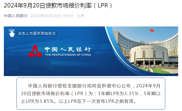 市场网首页 > 新闻中心 > 各地新闻 > 正文 9月LPR出炉 1年期和5年期以上均维持不变 2024-09-20 09:27:09 中国人民银行 中国人民银行授权全国银行间同业拆借中心公布,2024年9月20日贷款市场报价利率(LPR)为:1年期LPR为3.35%,5年期以上LPR为3.85%。以上LPR在下一次发布LPR之前有效。 (责任编辑:张一男)