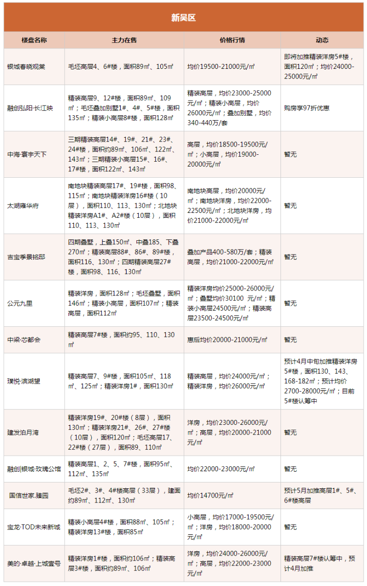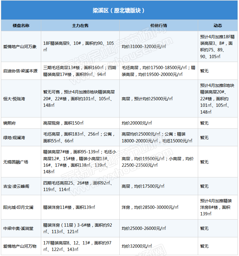 4月锡城主流在售项目及产品最新情报呈上。楼市成交稳步攀升,不少楼盘已经进行了一波加推抢占“金三”,进入4月,加推热情依旧不减,愉樾天成、熙悦·滨湖湾、太湖如院、华发首府、华侨城·运河湾、山河万物、悦珑湾、阳光城·印月文澜、银城春晓观澜、璞悦·滨湖湾、美的·卓越·上城壹号等一大波项目均表示在本月有加推计划。(注:下表整理内容为锡城主流楼盘、主流物业,均为售楼处报价)