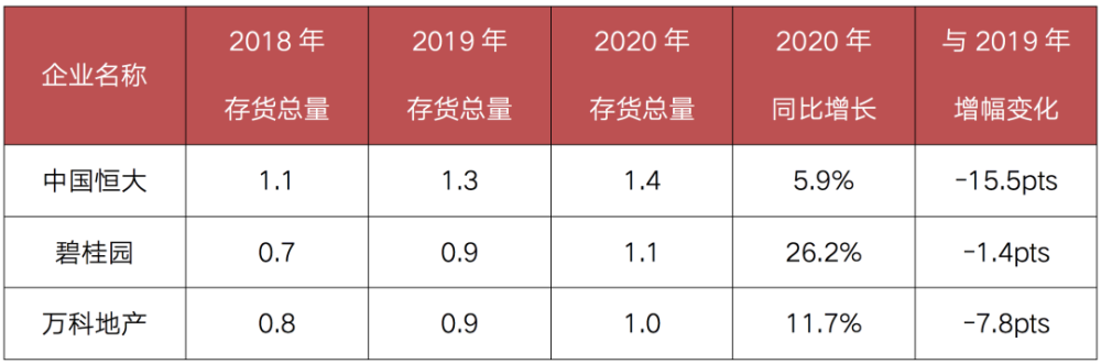 从企业角度而言,截至2020年底,存货规模达到万亿的房企有三家,分别是恒大1.4万亿元、碧桂园1.1万亿元和万科1万亿元,其中碧桂园和万科是首次进入万亿行列。
