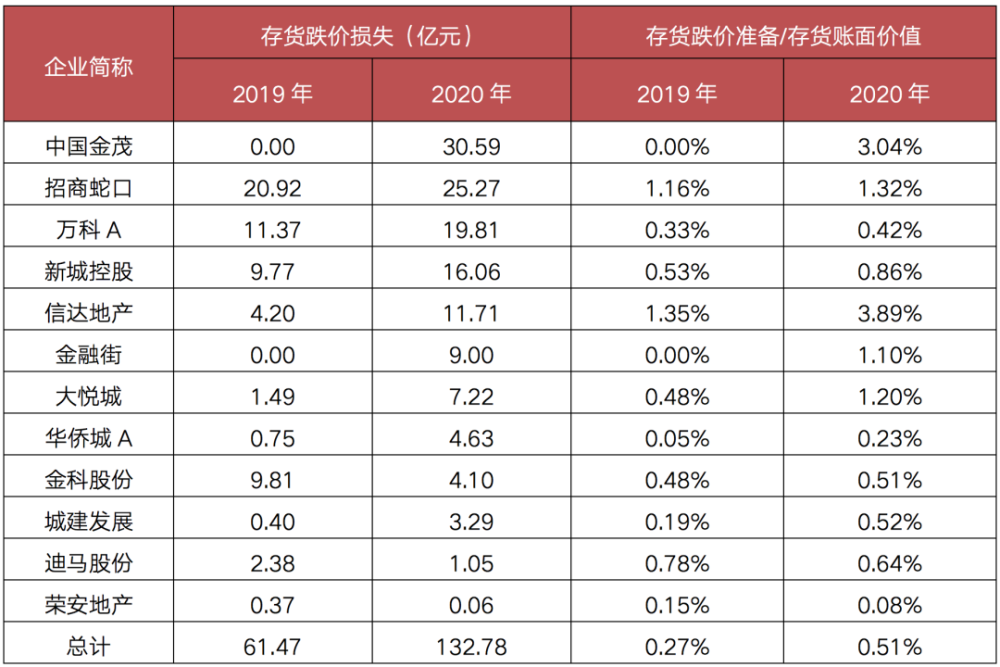 表:样本房企2019、2020年存货跌价损失及