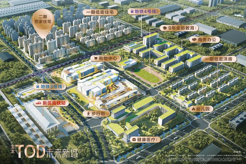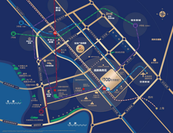 【宝龙·TOD未来新城】位居新吴区站前商贸区,享站前智能小镇利好政策,区域内苏南硕放机场联通全国,毗邻城际高铁无锡新区站,坐拥长三角经济圈,扼守3号线(在建,年底通车)、4号线(二期,拟规划)地铁出入口。演绎世界TOD生活典范:出高铁,进地铁,商场吃喝玩乐购,一站满足;商业、商务、生活、交通、潮流五心叠加,一城美好生活与无限商机在此汇聚。