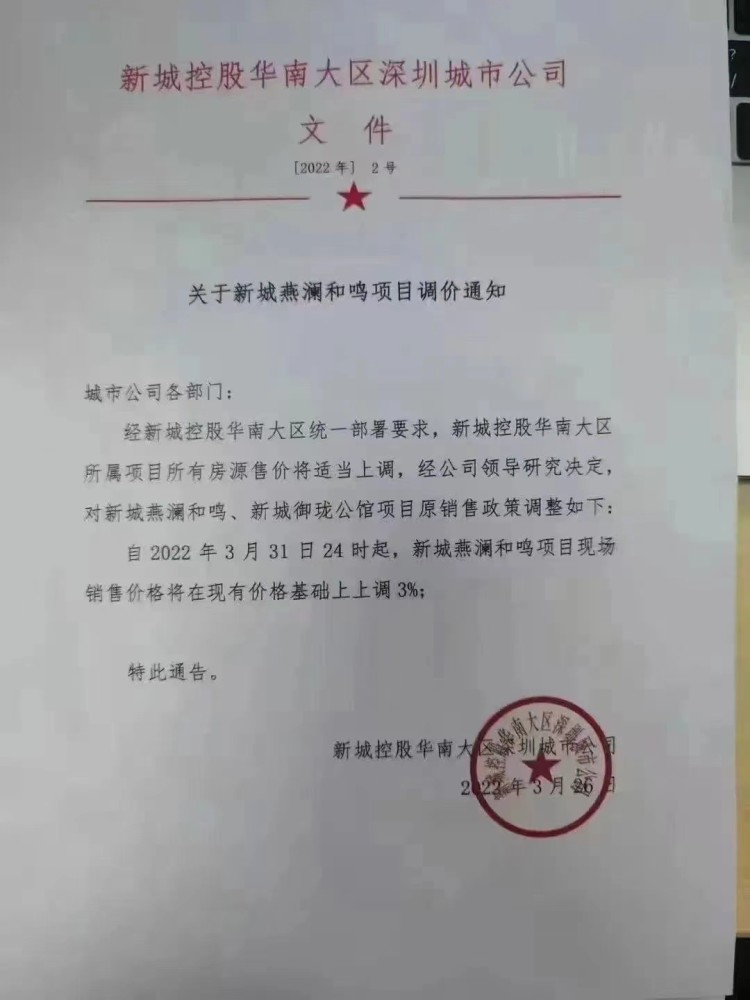 文件显示,经新城控股华南大区统一部署要求,所属项目所有房源售价将适当上调。经公司领导研究决定,对新城燕澜和鸣、新城御珑公馆项目原销售政策调整如下:自2022年3月31日24时起,新城燕澜和鸣项目现场销售价格将在现有基础上上调3%,落款为新城控股华南大区深圳城市公司,日期为3月26日。