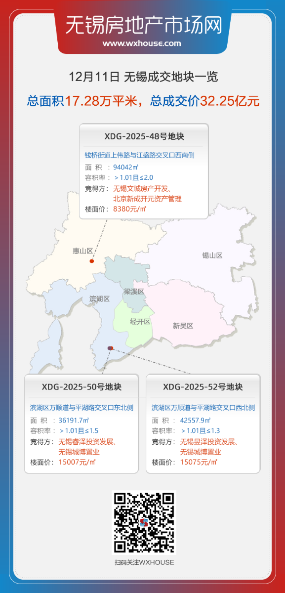 12月11日,锡经告字[2025]16号公告中3宗涉宅用地全部底价成交,分别位于惠山区和滨湖区,总面积约17.28万㎡,成交总价约32.25亿元,最高楼面价15075元/㎡。
