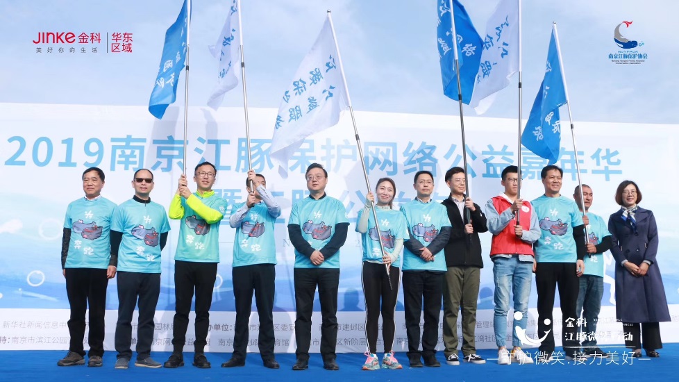 启动仪式上,相关领导嘉宾还为牛咔视频、江湾社区、金科华东江豚公益小队、江豚湾湾酷跑俱乐部、江豚观测队、高校江豚保护志愿团队等首批6支江豚公益小队进行了授旗。