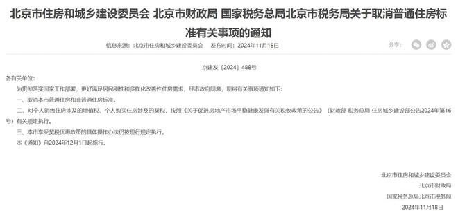 北京市住房和城乡建设委员会网站18日消息,北京市住房和城乡建设委员会等部门联合发布关于取消普通住房标准有关事项的通知(简称《通知》)。
