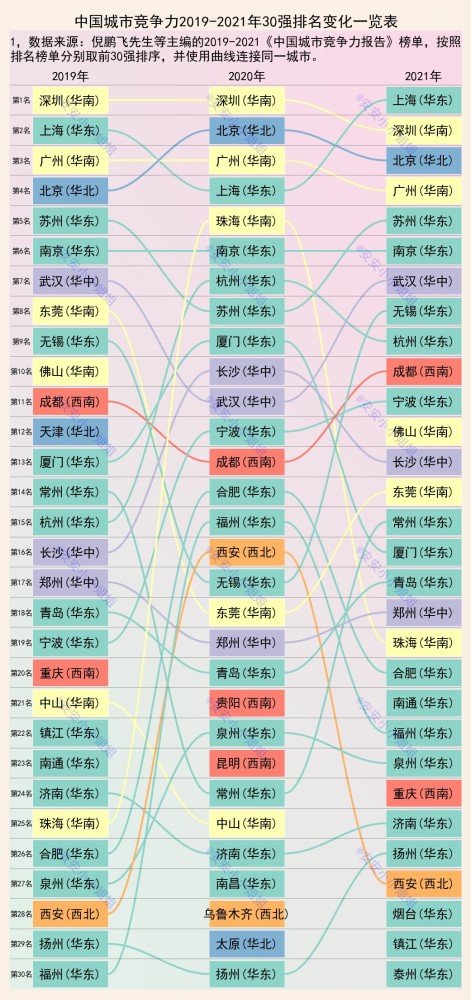 当然,也有排名相对稳定的,比如南京,连续三年均排名第6。