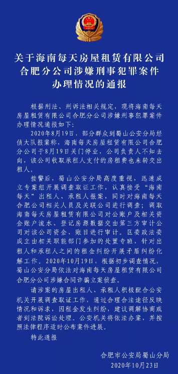 安徽网、大皖客户端讯 据合肥市公安局蜀山分局消息:10月23日,合肥市公安局蜀山分局发布了关于海南每天房屋租赁有限公司涉嫌刑事犯罪案件办理情况的通报。通报称,2020年8月19日,部分群众到蜀山公安分局经侦大队报案称,海南每天房屋租赁有限公司合肥分公司于8月19日关门停业,公司负责人不知去向,该公司收取承租人支付的房租费也未转交出租人。