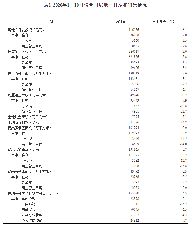 1—10月份,商品房销售面积133294万平方米,同比持平,1—9月份为下降1.8%。其中,住宅销售面积增长0.8%,办公楼销售面积下降14.5%,商业营业用房销售面积下降14.0%。商品房销售额131665亿元,增长5.8%,增速提高2.1个百分点。其中,住宅销售额增长8.2%,办公楼销售额下降12.8%,商业营业用房销售额下降15.8%。